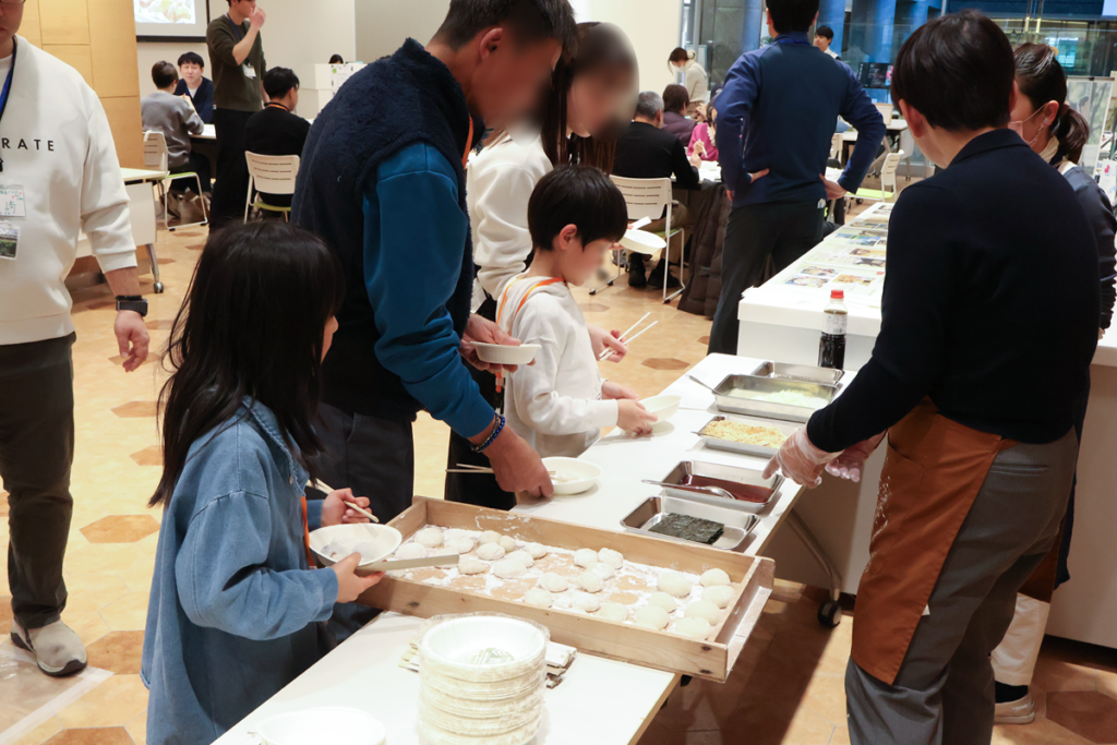 最近は餅つきができる機会も減っているので、餅つき体験ができるからというきっかけで来場された人も。皆さん興味津々で楽しそうに体験されていました。土佐れいほく地域では砂糖しょうゆやきな粉のほか、大根おろしをつけて食べるのだとか。皆さん出来たてのお餅を美味しそうに召し上がっていました。