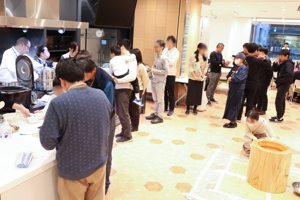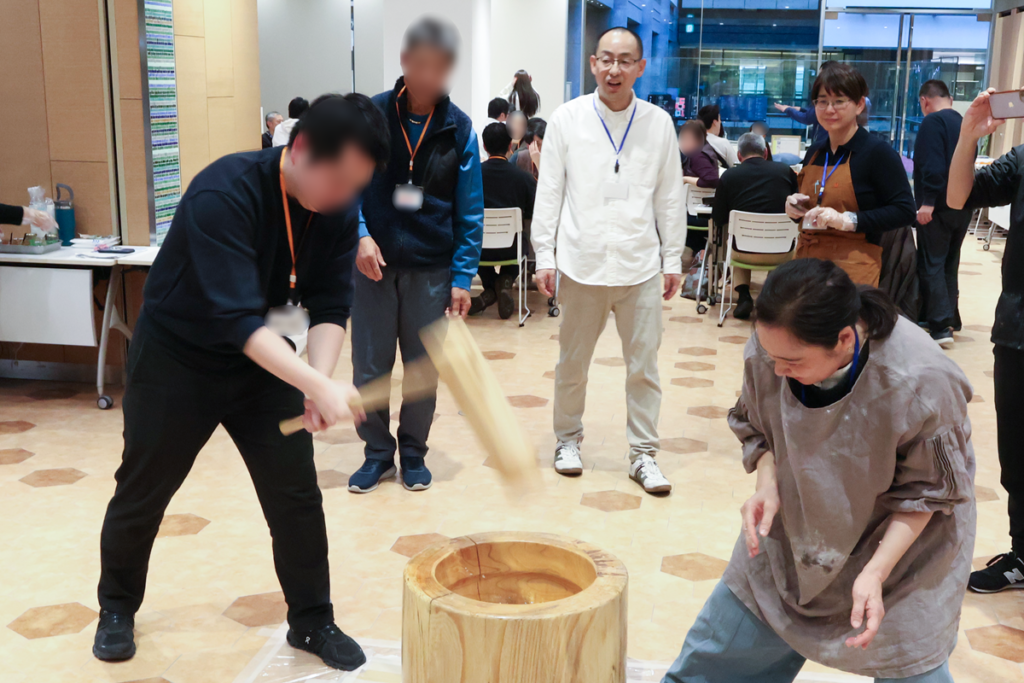 後半の交流タイムでは、お子様だけでなく大人も餅つきを体験。