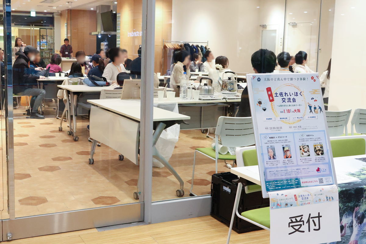 会場は大阪駅直結・グランフロント大阪北館にあるHDC大阪。土佐れいほく地域の魅力を知ってもらうため、「山里の文化と食」をテーマにした交流会を開催しました。