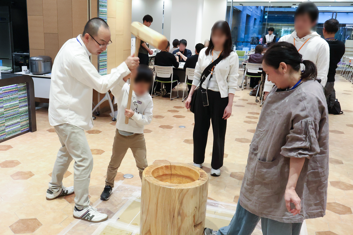後半の交流タイムでは、お子様だけでなく大人も餅つきを体験。